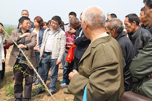 试验站首席专家蔡宇良带领大家参观了樱桃超细长纺锤形栽培模式、‘V’字形栽培模式和多主干篱壁式栽培模式。与果农的纺锤形和开心形栽培模式相比,这三个树形具有矮化密植、早成形、早挂果、易管理、产量高等特点,此外还避免了内膛光秃、结果枝外移现象的发生,现场指导农民采取抹芽和刻芽技术促进樱桃树早成形。