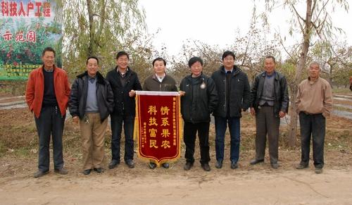 曹谢虎是白水县林皋镇可仙村一名普普通通的果农,前几年务苹果“人把苦下扎了,树把人亏扎了”,一年到头苹果卖不下几个钱。2006年,作为“校县科技入户”专家组成员的我校杜志辉副研究员包抓了曹谢虎的果园。杜志辉查看了果园后,给曹谢虎开除了第一剂“药方”: 间伐。听完杜志辉的指导,老曹心里犯嘀咕:“这纯粹胡整呢,把树都截完了,那儿结苹果?”禁不住杜志辉的“软磨硬泡”,老曹抱着试一试的态度,在6亩园子中选了1亩做试验。年底一算账,产量减少了,优果率却提高了,每斤还比没有间伐的多卖了1元钱!这下,老曹被白水苹果试验站其貌不扬的杜志辉折服了,左一个杜老师右一个杜老师地叫,全营养施肥、肥水一体化、病虫综合防控、……“只要是杜老师说的,我都照做”。如今老曹有了名,成立了苹果专业合作社,去过美国上了哈佛的讲堂,还在中央电视台上“露了脸”。可他心理却有一个结,指导他们发财的杜志辉老师,却依然是个副研究员,更何况杜老师发明的“诱虫带”,成本低、效果好,年推广量要达到1000万条呢。当听说学校农业科技推广职称评审小组的成员要来自己的果园现场查看杜老师的业绩时,曹谢虎就和他们仙果合作社的社员一合计,要用农民特有的方式为“杜老师”说道说道。于是,就有了本文开头的一幕。