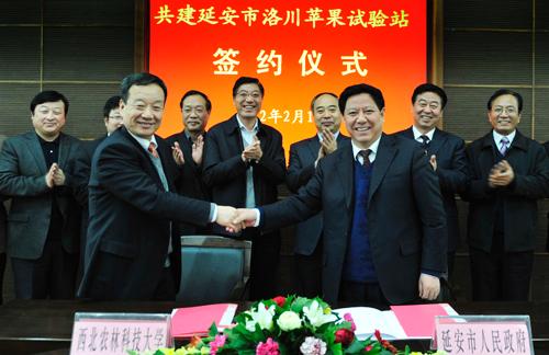 2月19日下午,我校与延安市政府在国际交流中心举行了共建“西北农林科技大学延安市洛川苹果试验站”签约仪式。校长孙其信,延安市市委副书记、市长梁宏贤,延安市副市长杨霄,杨凌示范区管委会副主任郭建树以及延安市农业局、果业局、洛川县政府和我校党委校长办公室、推广处、园艺学院负责人出席签约仪式。常务副校长赵忠与延安市副市长杨霄分别代表双方在议书上签字。