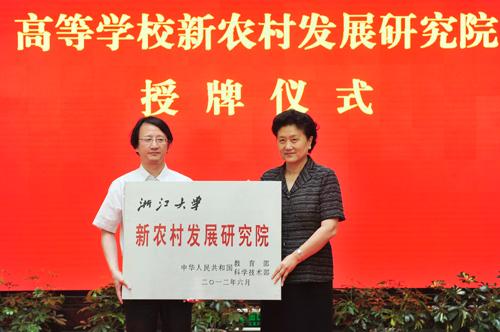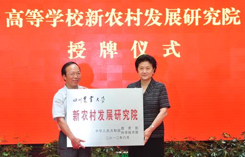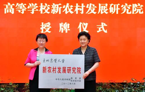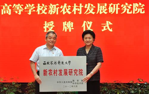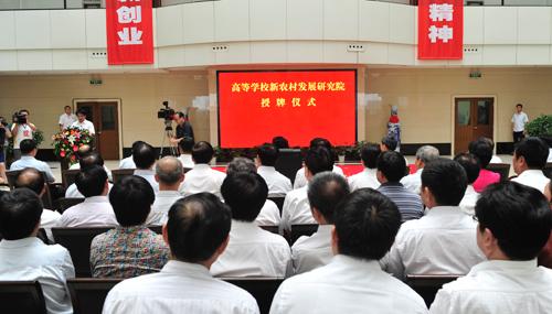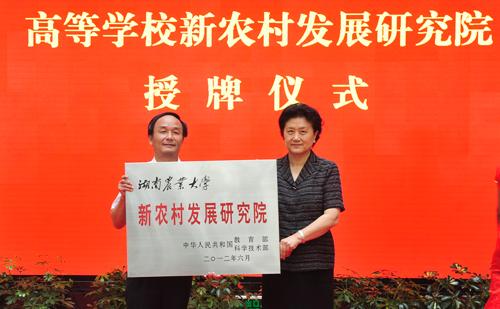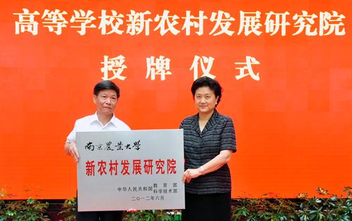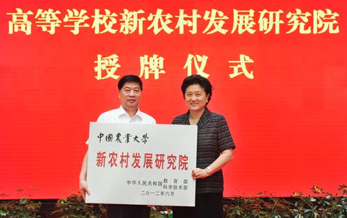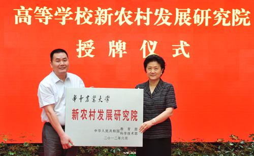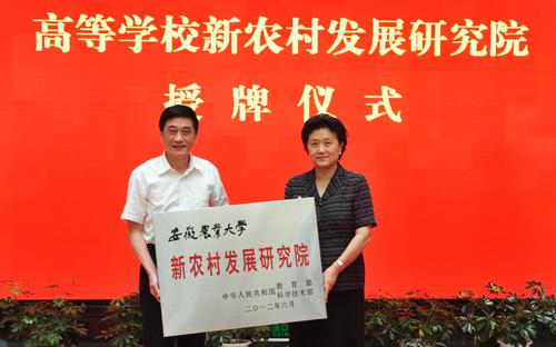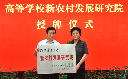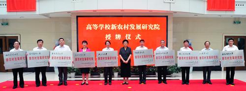 为认真贯彻落实全国科技创新大会精神,提升科研院所、高等学校服务经济社会发展能力,7月11日,首批高等学校新农村发展研究院授牌仪式及建设工作会在我校隆重举行。中共中央政治局委员、国务委员刘延东出席仪式并亲自为我校等10所高等学校新农村发展研究院授牌。