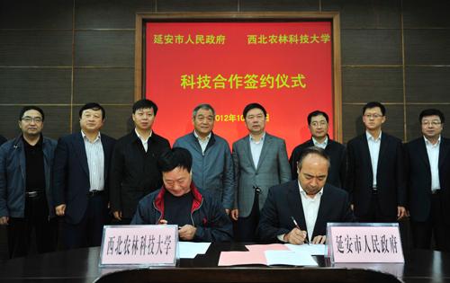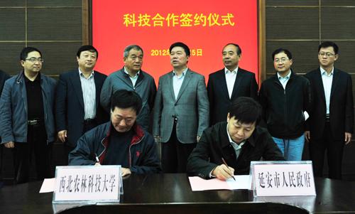 10月15日下午,我校与延安市签订关于加快延安市国家现代农业示范区建设战略合作协议。梁宏贤市长和李华副校长分别代表双方在协议上签字。省委常委、延安市委书记姚引良,我校党委书记张光强,延安市副市长彭祖佑,延安市农业局、林业局、畜牧局、科技局、黄陵县等负责人和学校有关部门、相关院系领导和专家40余人参加签约仪式。