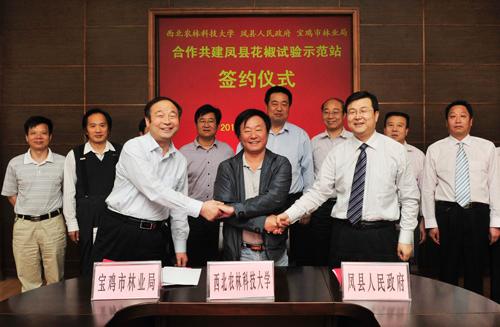 为充分发挥我校的科技、人才优势和凤县以及宝鸡市花椒产业的资源与区位优势,实现校地优势互补、合作双赢,促进当地花椒产业的快速、健康、稳步发展。5月15日,我校与凤县人民政府和宝鸡市林业局,在杨凌签订了合作共建“西北农林科技大学凤县花椒试验示范站”协议。李华副校长和凤县县长郑维国、宝鸡市林业局局长刘汉卿在协议上签字。宝鸡市副市长王拴虎和学校推广处、林学院领导及专家出席了签字仪式
