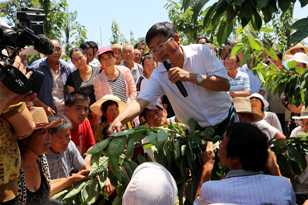 蔡宇良走到樱桃树下,一边现场修剪一边向果农示范。果农们挤在樱桃树下,认真学习,不时提问,现场示范进行了整整一个多小时,最后还是在学校扶贫办办公室副主任崔永健的“这是今天的最后一个问题声”的催促声中,满头大汗的蔡宇良才结束了现场指导。此时,已是下午两点了。