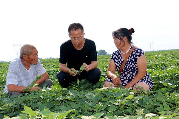 在黑池镇428亩有机红薯脱贫攻坚示范园中,陈越现场指导农民在目前阶段水肥管理应注意的措施。这时,一位妇女拿着几株发黄的红薯秧匆匆赶来,咨询陈越是否红薯有了病害。陈越仔细查看后,告诉她并无大碍,这位妇女才放下心来。